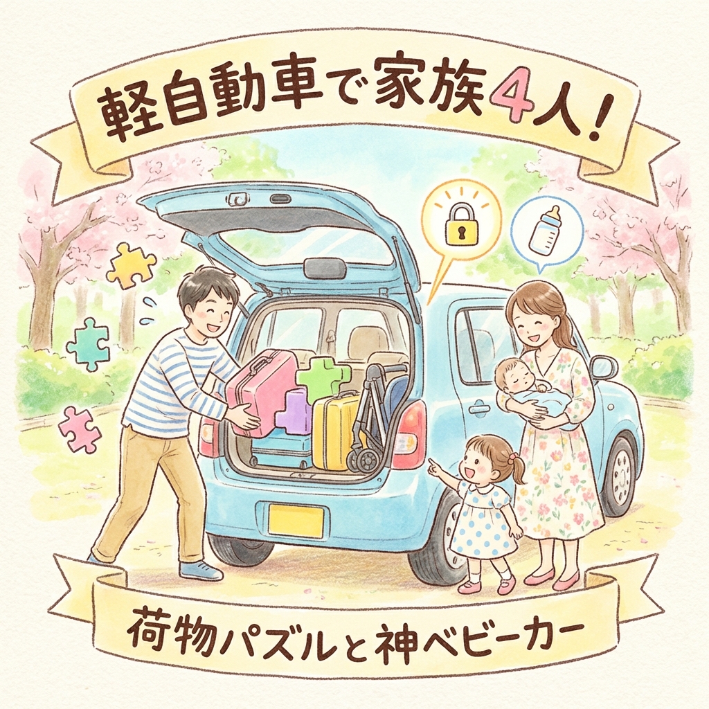 今回は、たまに乗る普通の軽自動車(ヒンジドア)にチャイルドシートを2台設置して、家族4人で限界まで使い倒している「リアルな積載事情」から、荷物を劇的に減らす神ベビーカー、そして絶対にやっておくべき安全対策までをまとめました。